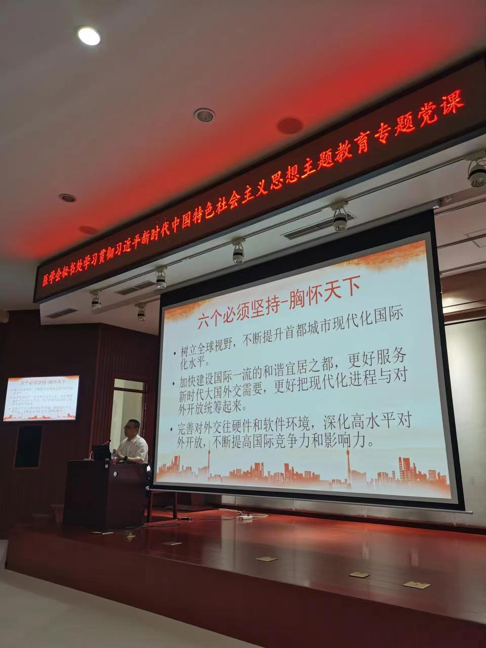 6月30日,医学会秘书处党总支书记、秘书长王建东同志以“运用好‘六个必须坚持’的立场观点方法,推动学会高质量发展”为题,为医学会秘书处全体职工讲授了学习贯彻习近平新时代中国特色社会主义思想主题教育专题党课。