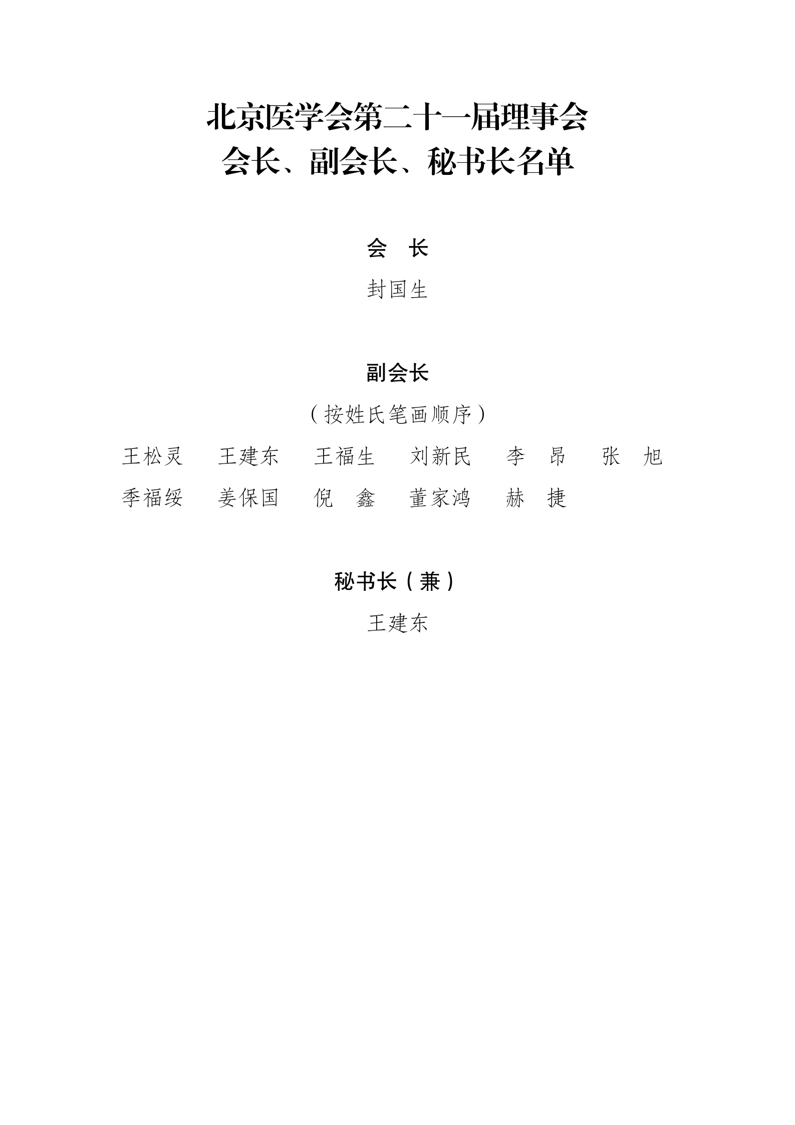 北京医学会第二十一届理事会会长、副会长、秘书长名单